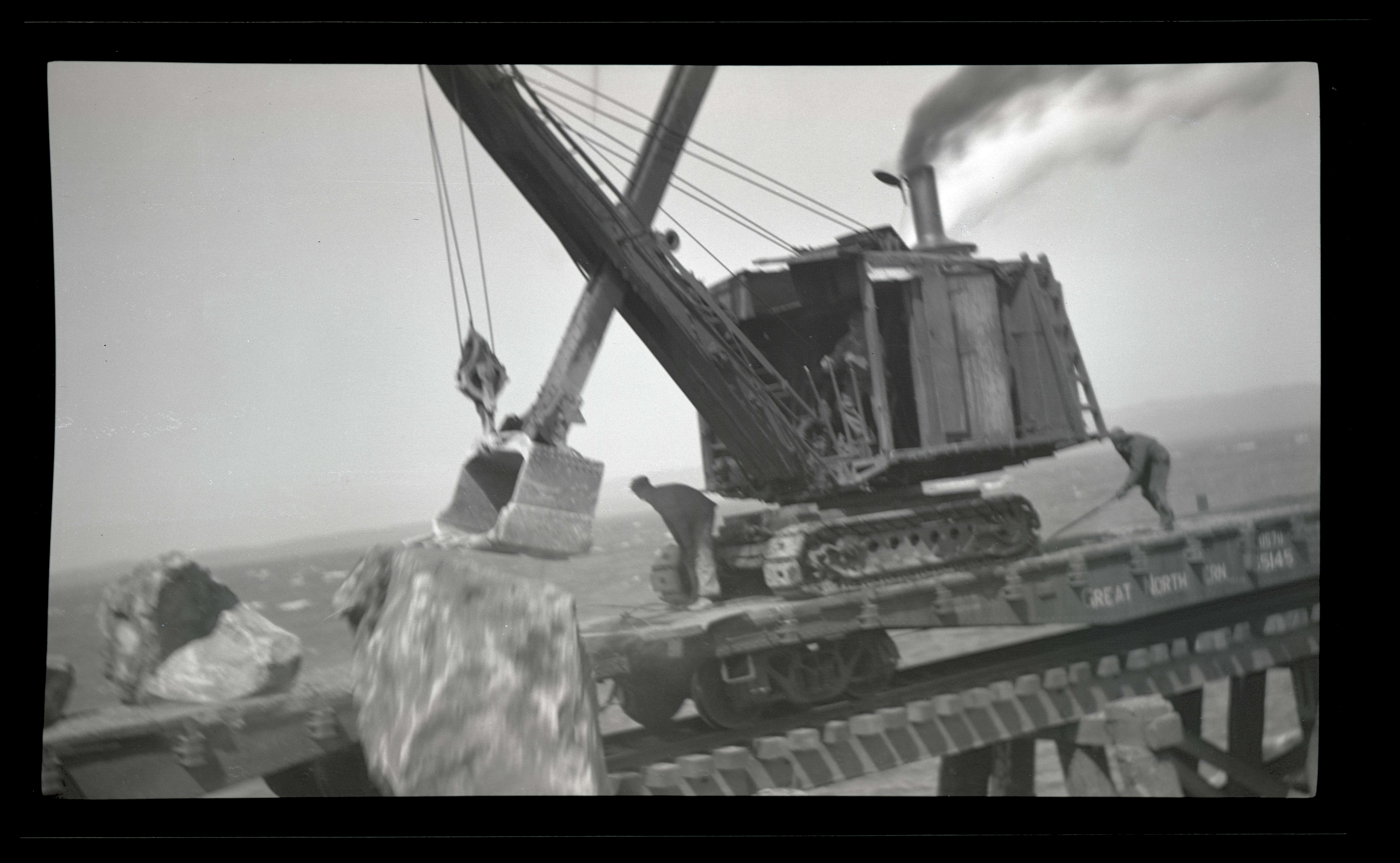 Crane pushing boulders on the South (?) Jetty, c.1931.