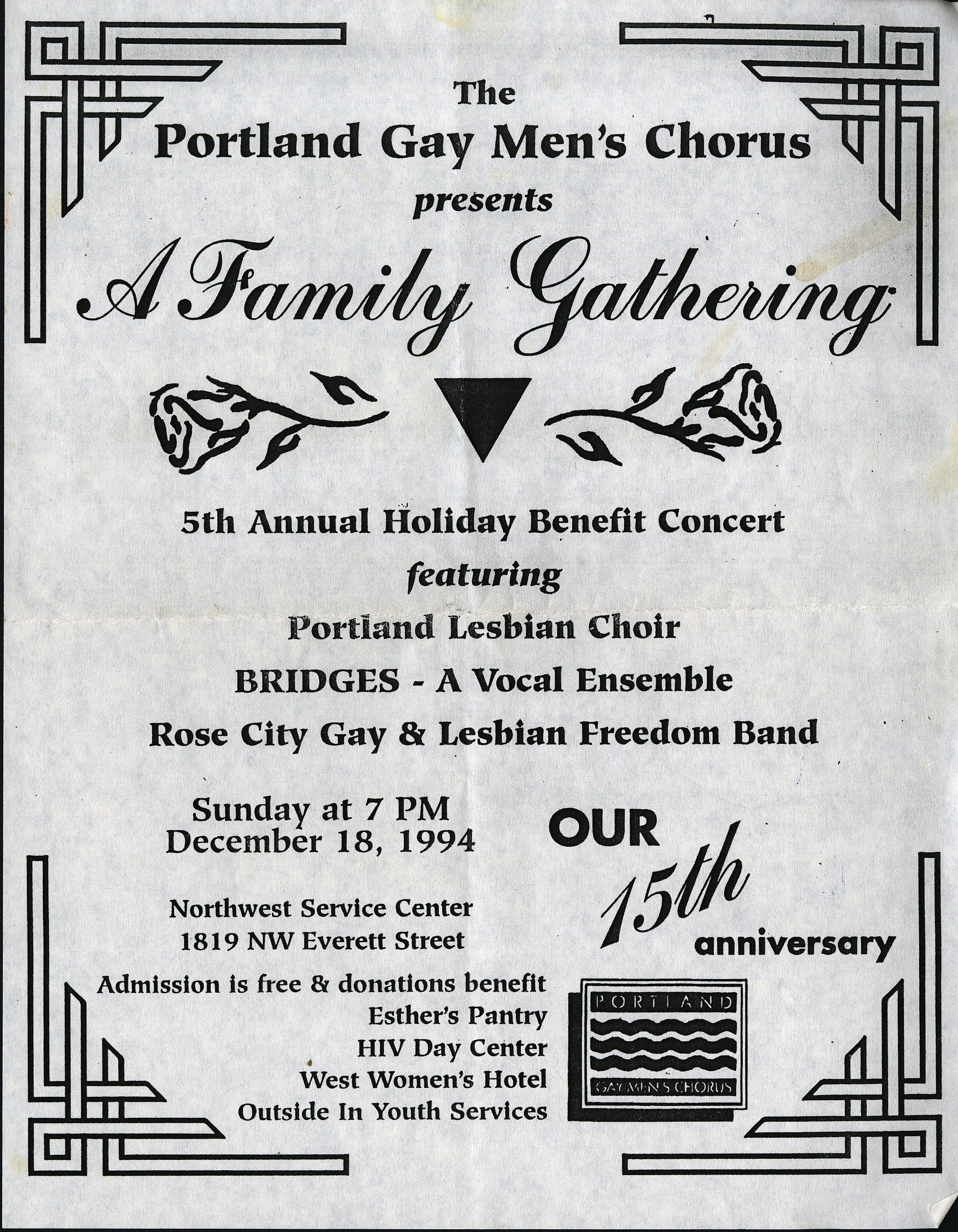 The Portland Gay Men's Chorus (PGMC) was founded in April 1980 to perform a concert as part of that year's local Gay Pride Festival. Twenty men responded to an ad published by Gary Coleman in the local community paper, The Fountain. That June, the group organized and elected officers, with the entire chorus serving as the board of directors. PGMC, which was formally incorporated on June 30, 1981, is recognized as the fourth oldest LGBTQ (lesbian, gay, bisexual, transgender, queer) “affinity” chorus in the United States. Its mission is “to expand, redefine, and perfect the choral art through eclectic performances that honor and uplift the gay community and affirm the worth of all people."