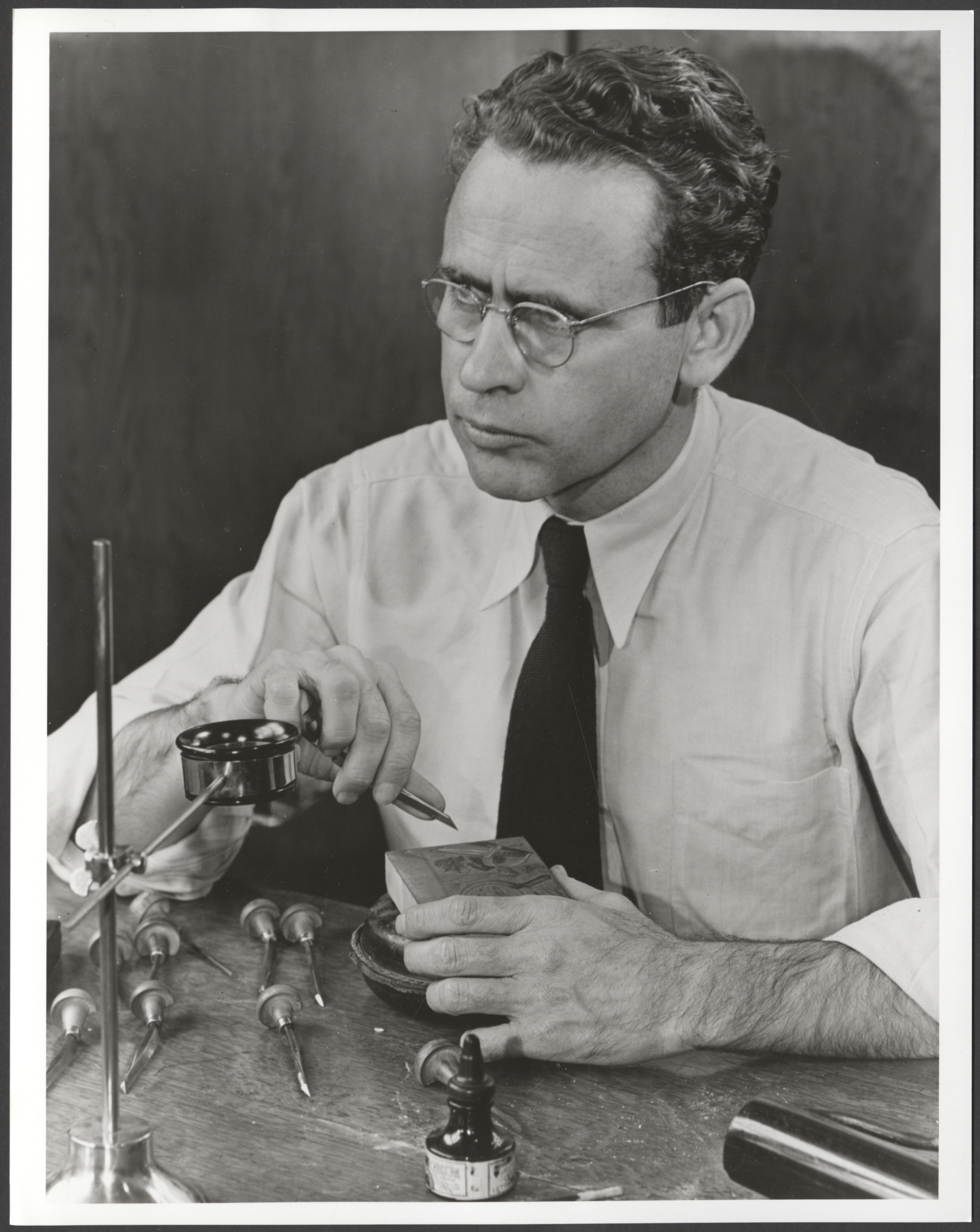 Lloyd J. Reynolds engraving a woodblock, c. 1930s..