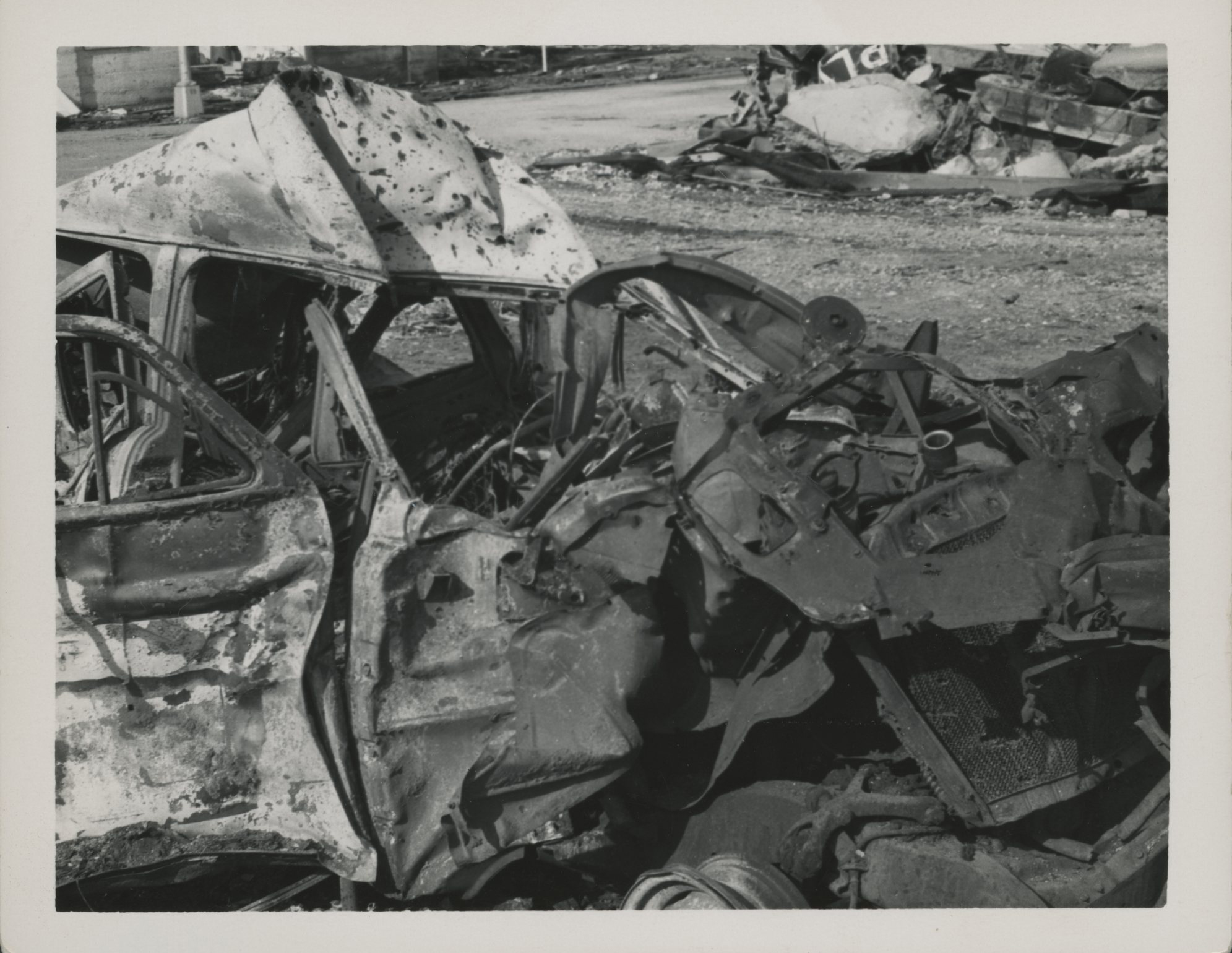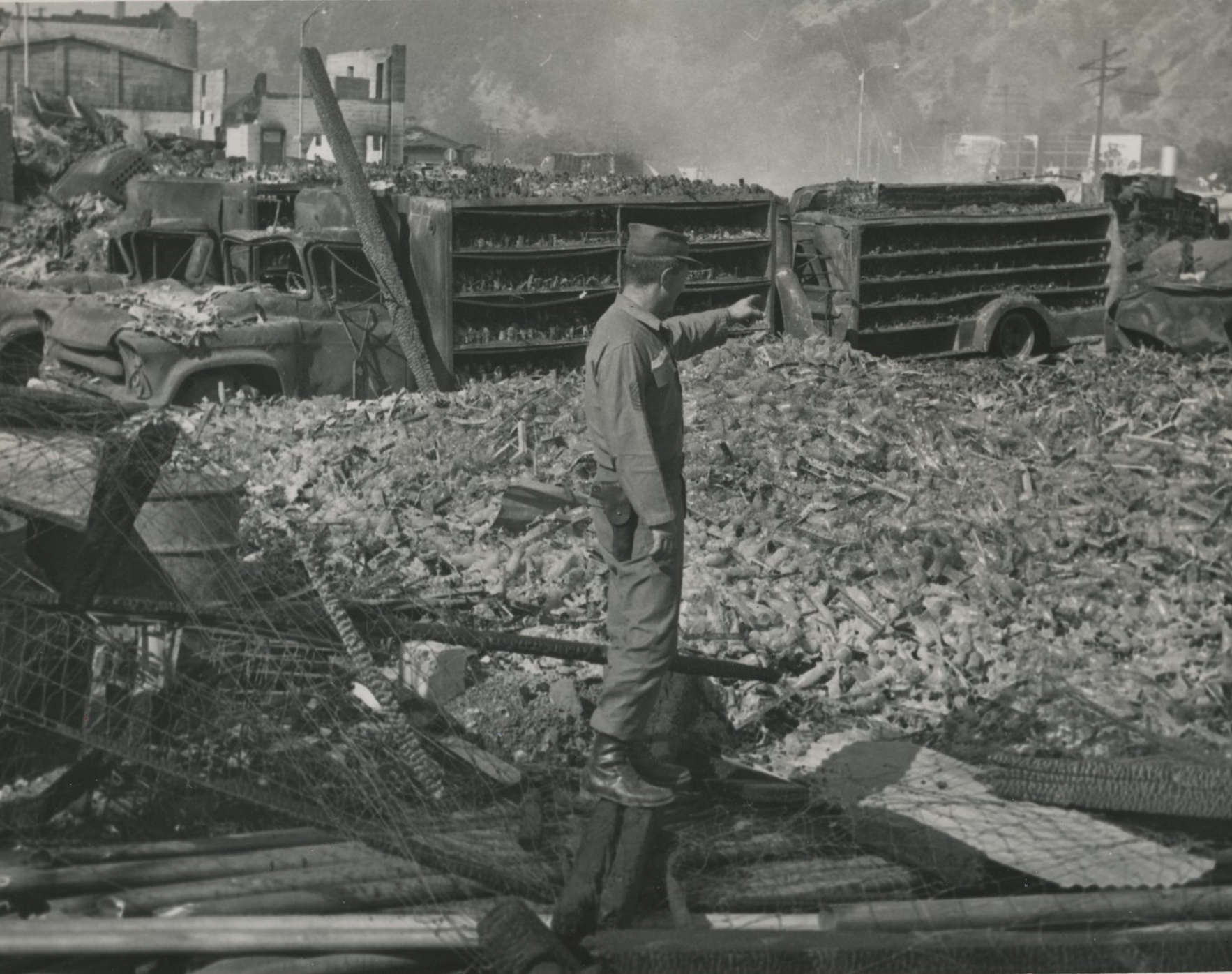 The Blast, which left a crater twenty feet deep and over fifty feet in diameter, leveled eight blocksof Roseburg's commercial core. Contractors later reported that newer pumice-block structures (that is, those made of concrete) fared worse than older brick buildings. For two weeks, over a hundred Oregon National Guard troops patrolled the blast area—called "ground zero" by Mayor Harlow Jacklin and others—so the coroner and other investigators could recover human remains and inspect structural damage.