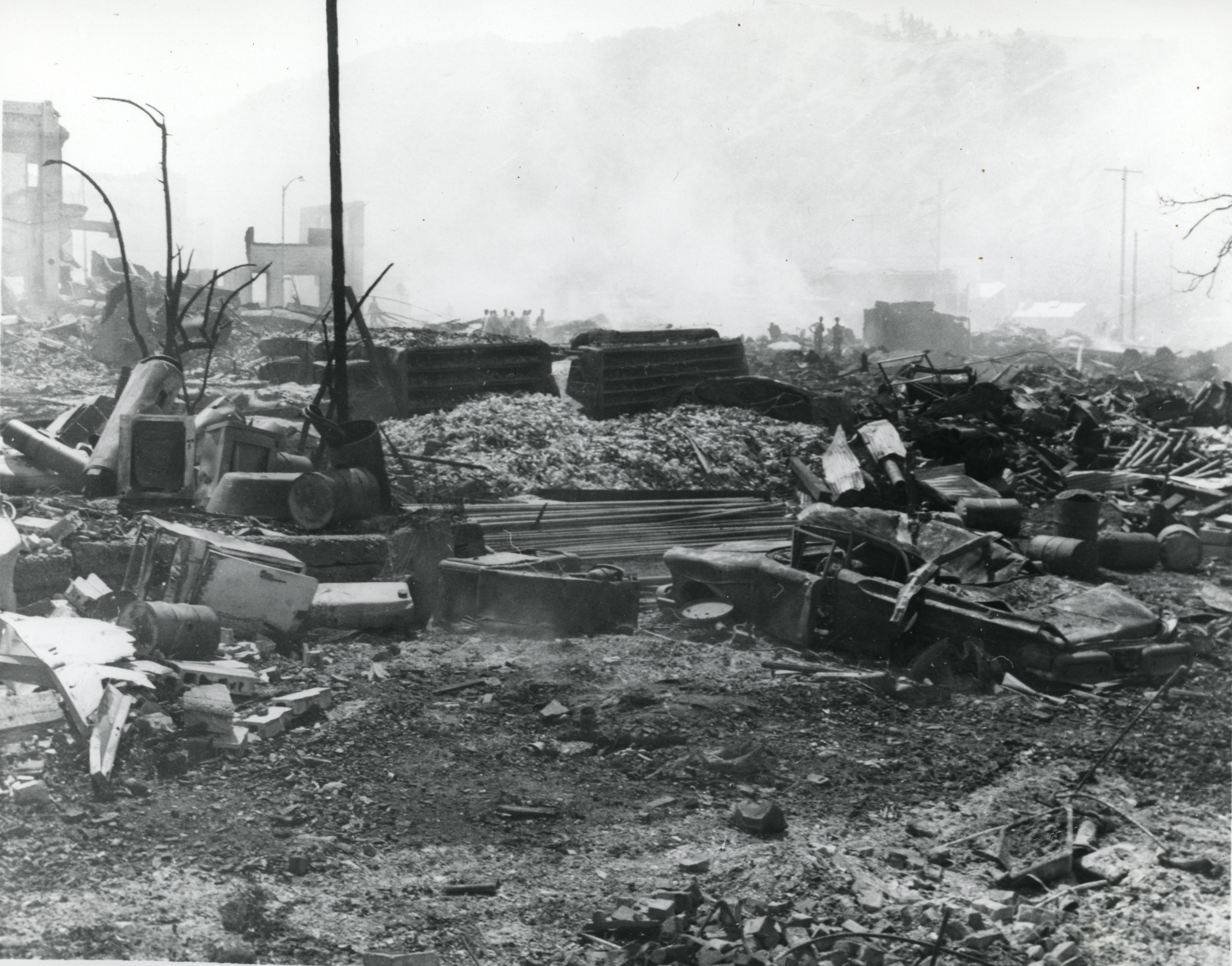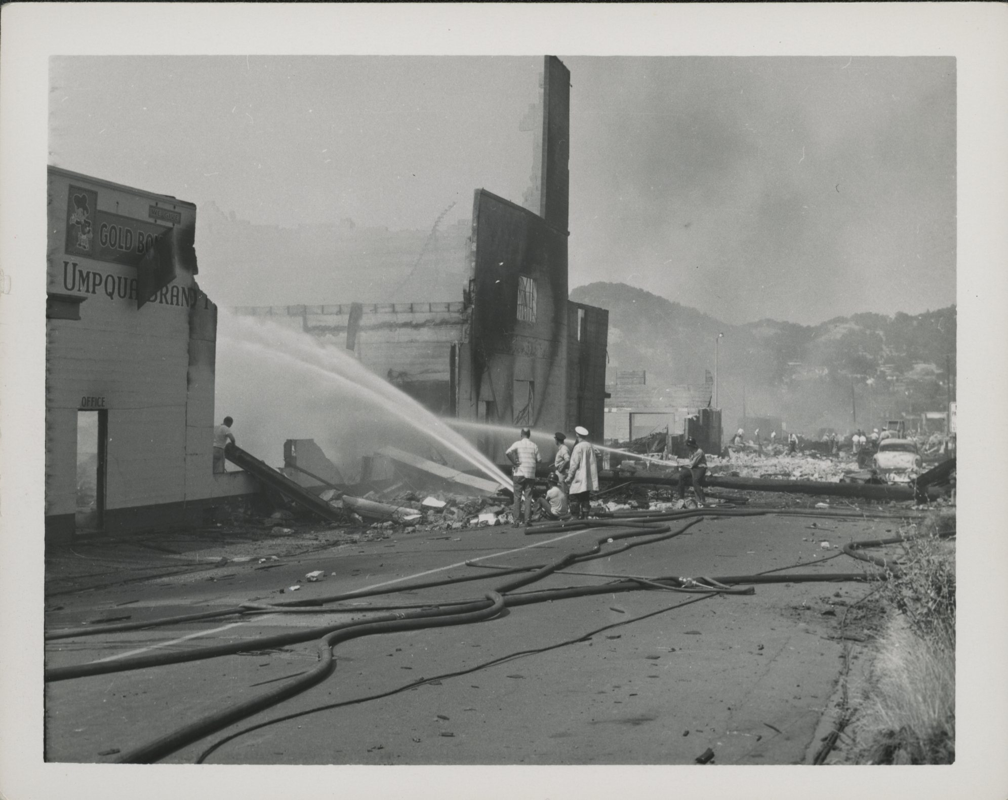 In the early morning hours of August 7, 1959, a parked truck—loaded with two tons of dynamite and over four tons of ammonium nitrate—caught fire outside a supply store on the edge of downtown Roseburg. The resulting explosion, known locally as The Blast, sent a ball of flame and a mushroom cloud of smoke over two thousand feet into the air. A Roseburg policeman described the explosion as looking like "an A-bomb"; a pilot flying over the vicinity at the time actually thought there was a Soviet attack. The Roseburg explosion attracted national attention and resulted in stricter explosives-transport safety regulations and enforcement by the Interstate Commerce Commission.