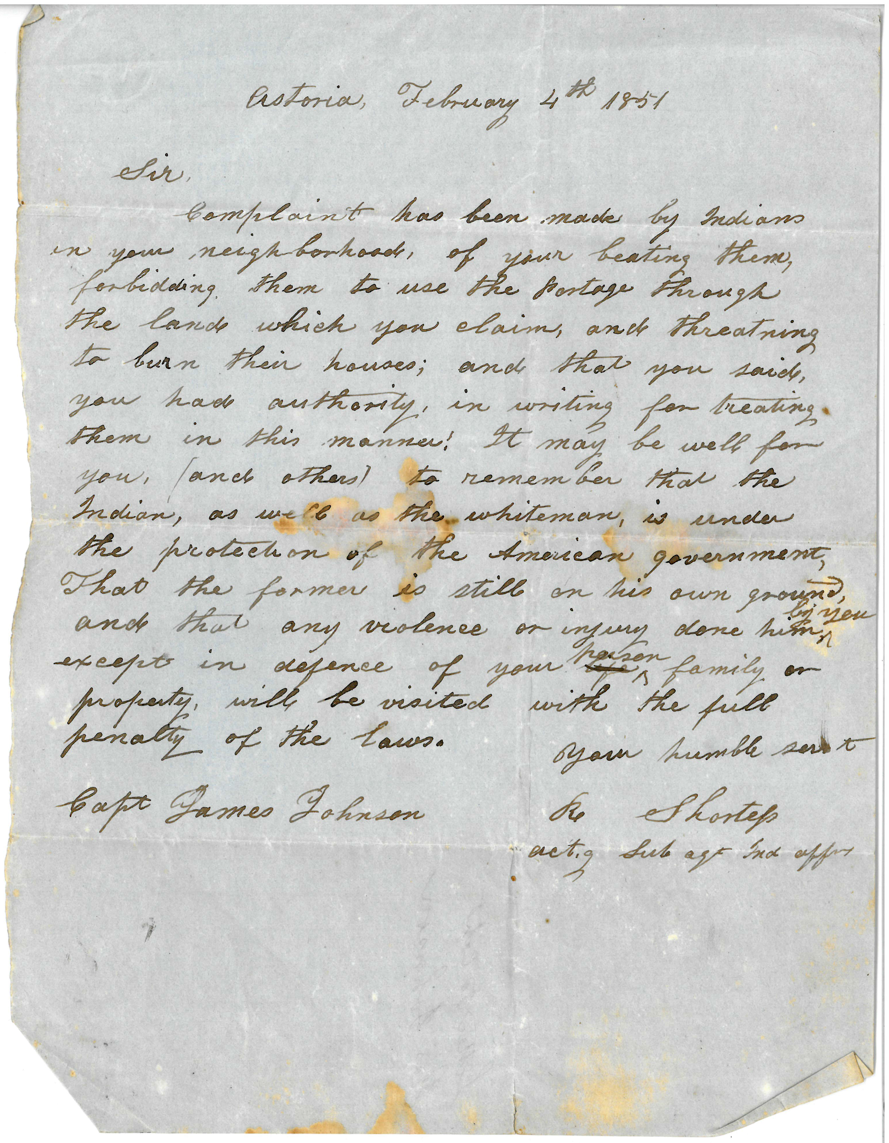 Letter from Shortess to Capt. James Johnson, warning him to stop abusing Native Americans, 1851.