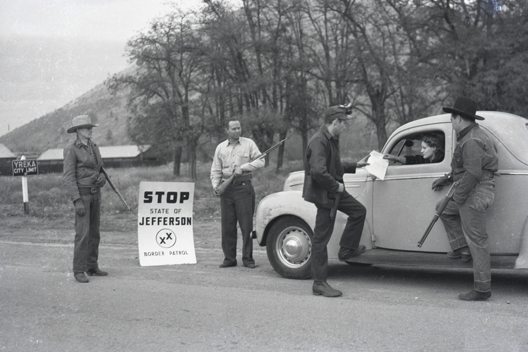 Proponents of the State of Jefferson stop motorists on the outskirts of Yreka, c.1941.