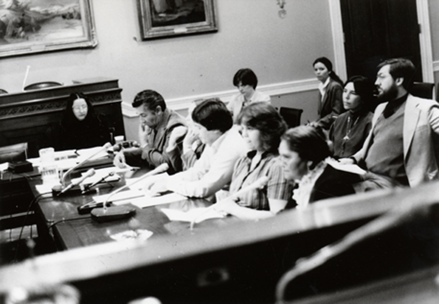 Kathryn Jones (Harrison), far left, speaks at a restoration hearing for the Grand Ronde, 1983.