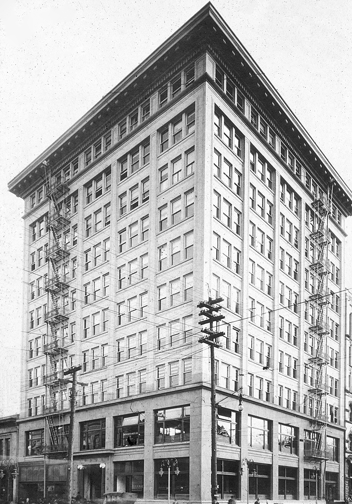 Following the completion of the Portland Hotel in 1890, the partnership began a productive twenty-year period of designing buildings for Portland’s most prominent institutions and individuals. Whidden and Lewis were hired by William S. Ladd in 1890 to design the six-story stone-and-brick Concord Building at the corner of Southwest Second and Stark in Portland. The firm then designed a series of commercial buildings on Portland’s Southwest Third Avenue, including the Gilbert Building, the Hamilton Building, and the Postal Building, all of which are listed on the National Register of Historic Places. Portland’s Failing Building, Corbett Building (demolished), Imperial Hotel, Wilcox Building, and Stevens Building—all completed between 1900 and 1914—are representative of the firm’s early twentieth-century commercial architecture.