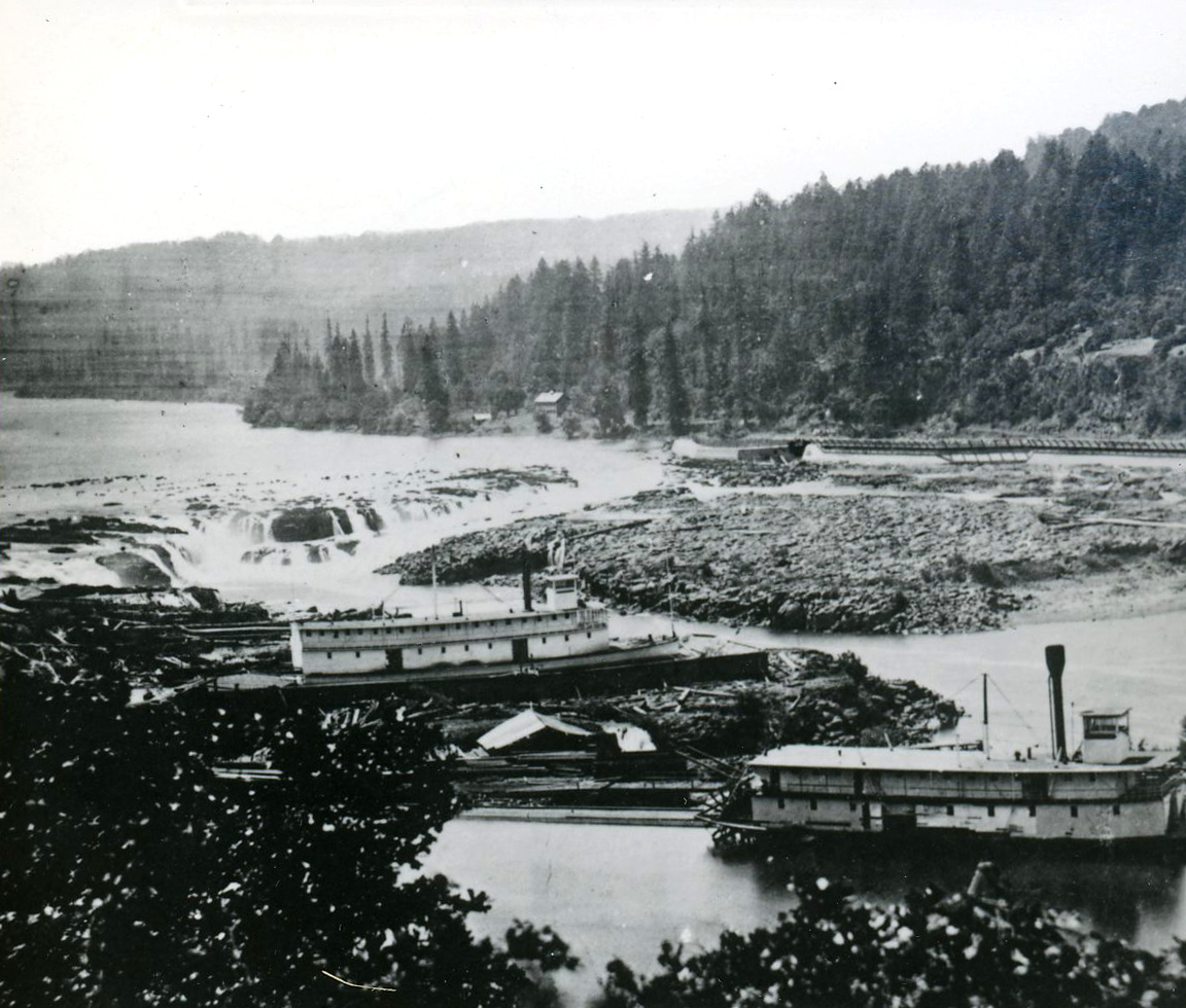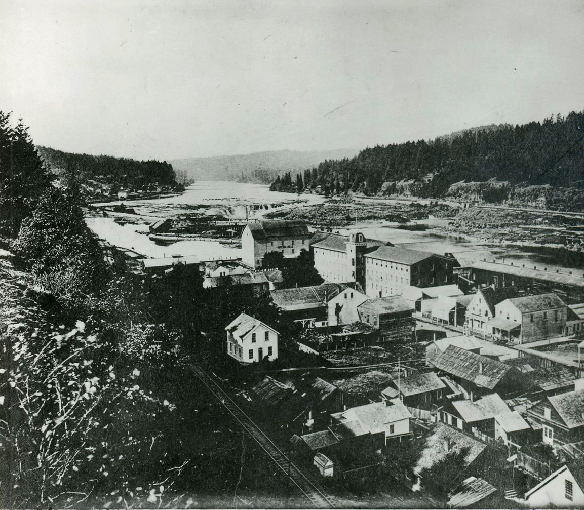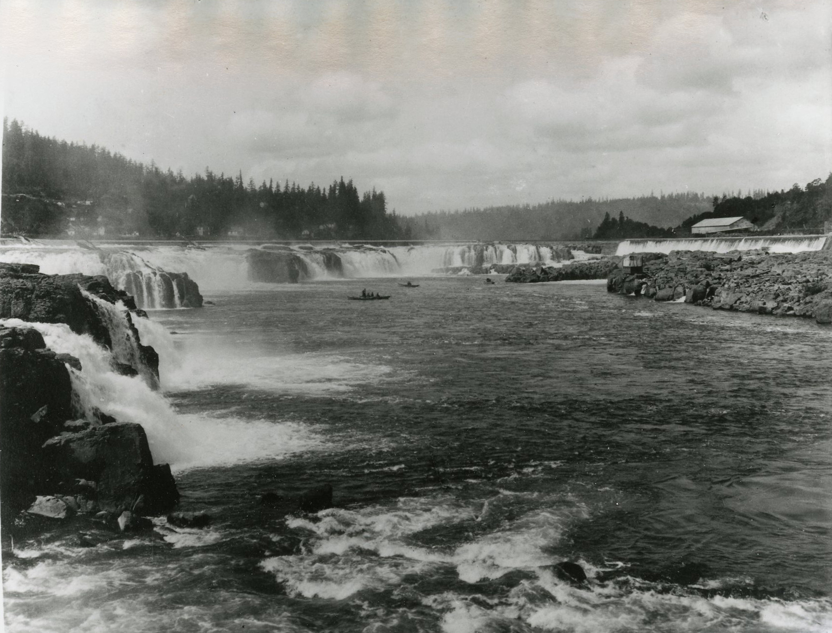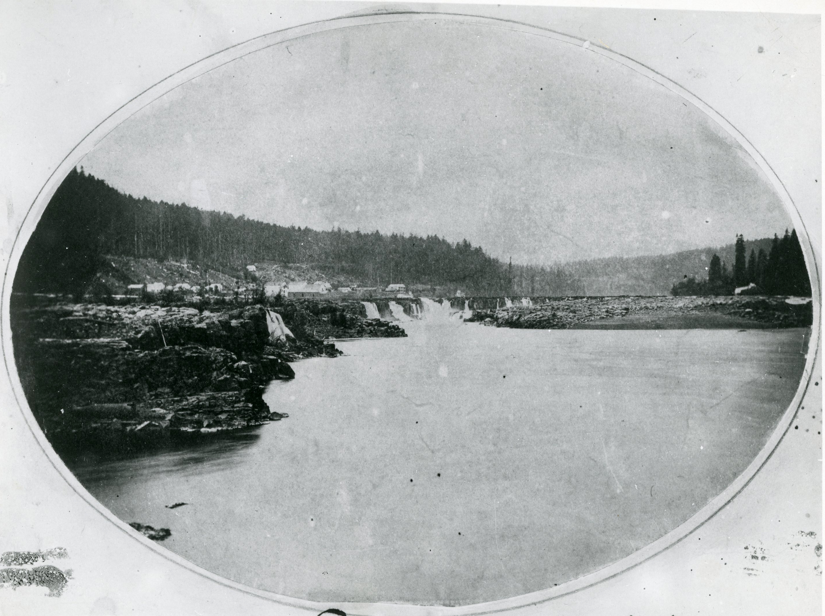 Chief Factor John McLoughlin of the Hudson’s Bay Company established the first non-Native settlement at Willamette Falls in 1829, and he built a sawmill there. After 1846, when the Oregon Treaty was signed, Americans constructed sawmills and fabric mills on both banks of the river at the falls. At Oregon City, on the east bank of the Willamette, settlers put in place the first United States government in the West. The town of Willamette Falls was established to the south, and Linn City (present-day West Linn) was across the river. The newcomers worked the fishery at the falls, constructing at least one fish wheel (Brown Brothers in 1896) at the base to capture salmon before the fish jumped the falls.