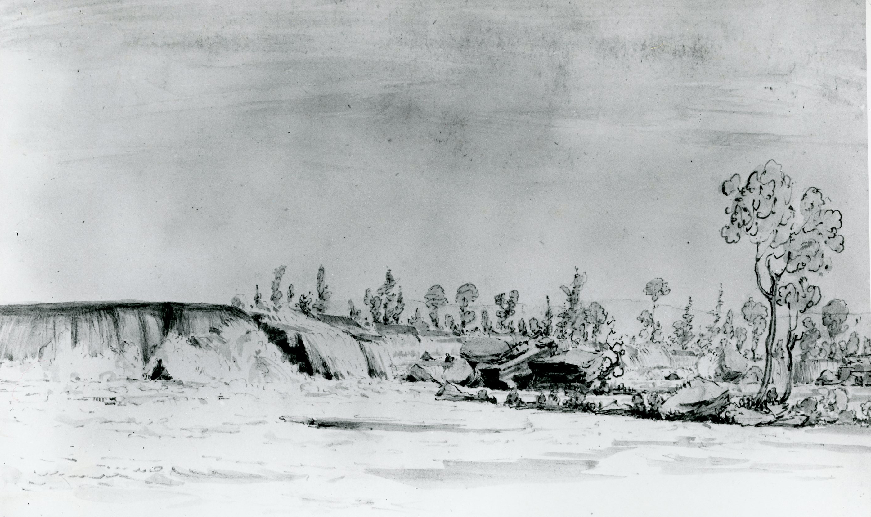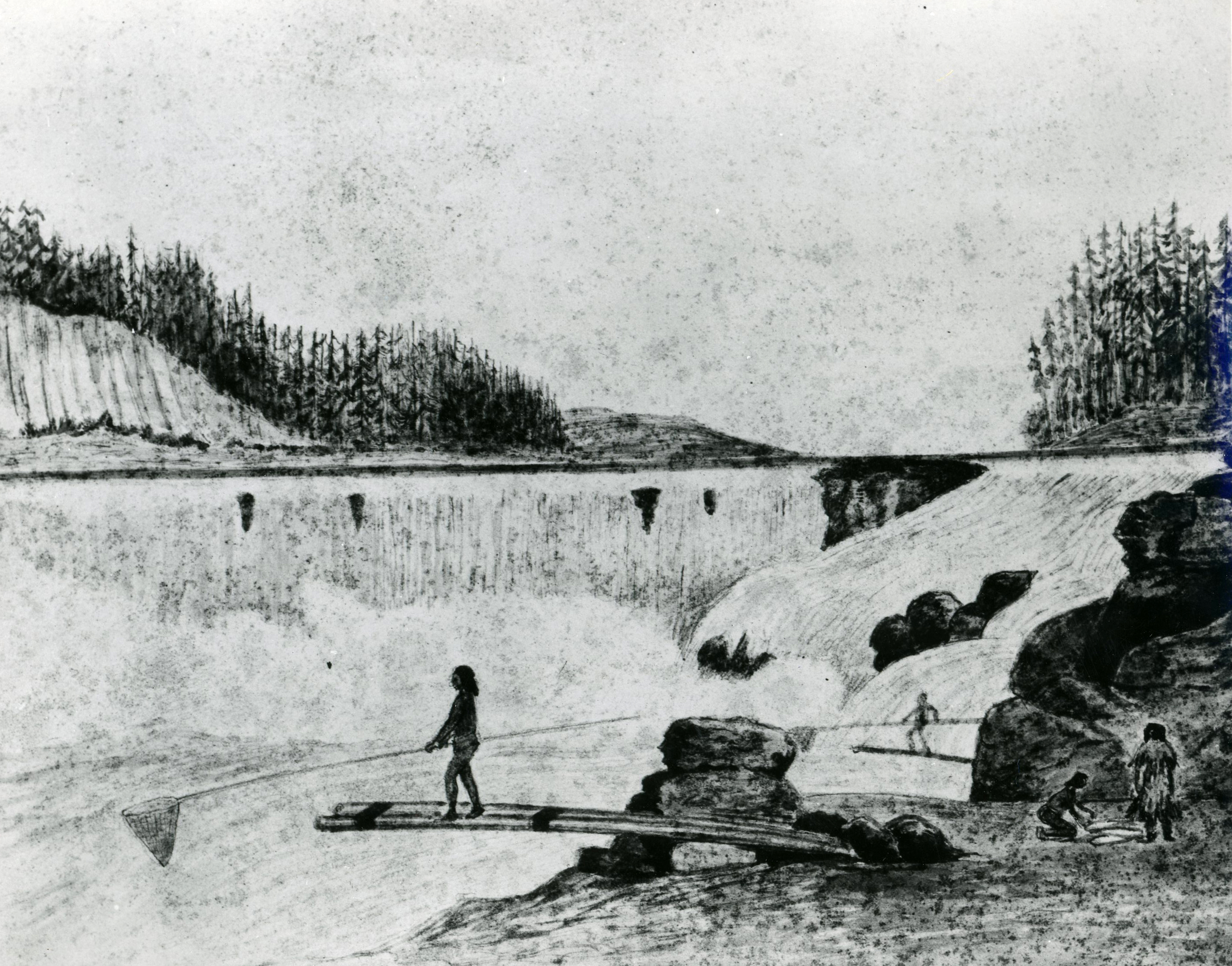 Sketch of Willamette Falls and Native fishers, by Joseph Drayton of the Wilkes Expedition, c. 1841.