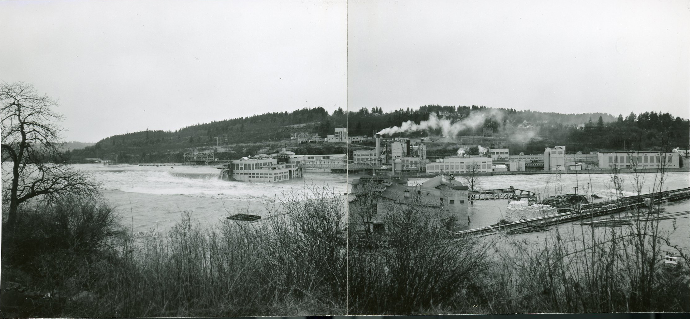 An aerial view of Willamette Falls, with West Linn on the left and Oregon City on the right. The mill belonged to Crown Zellerbach..