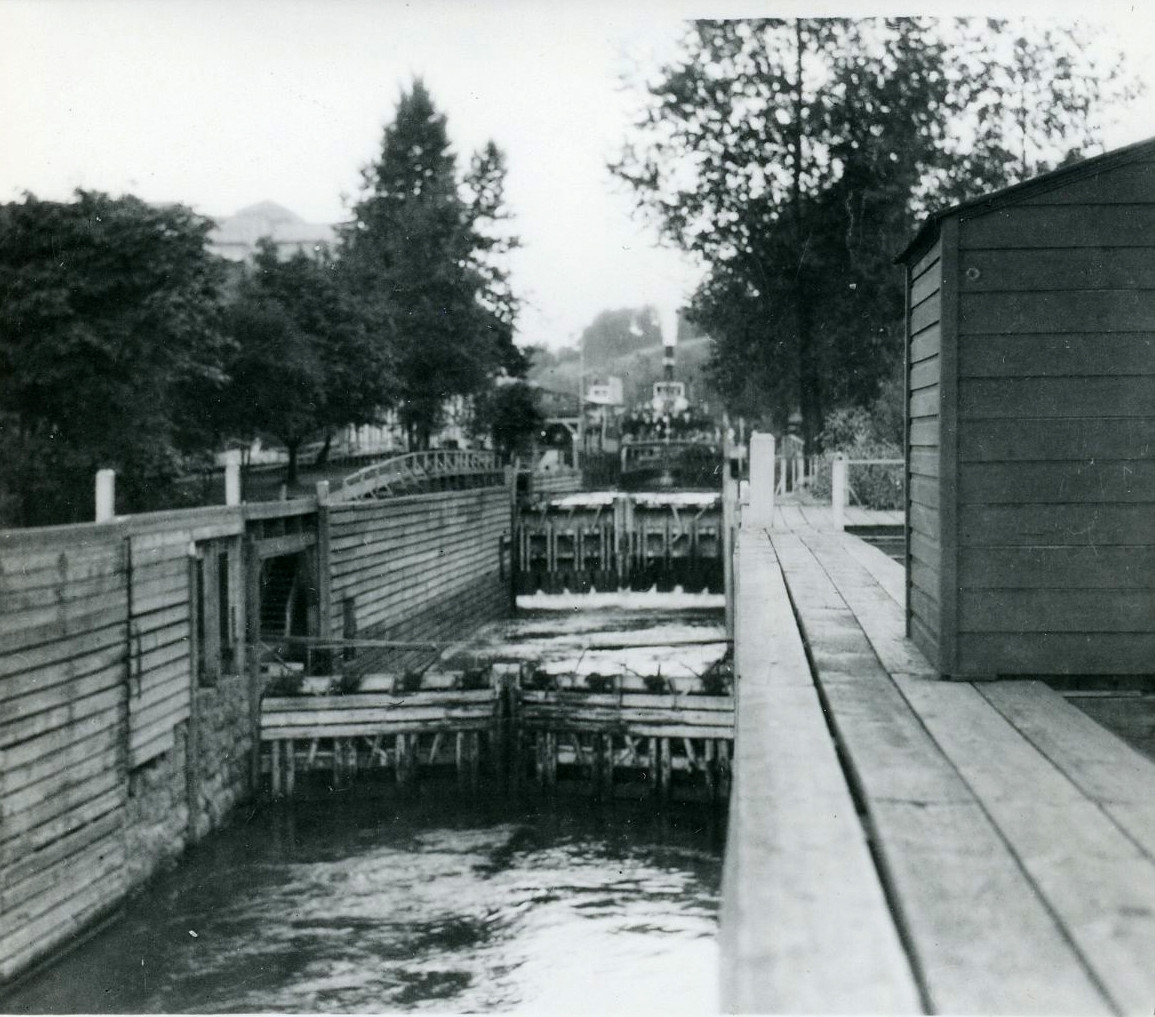Farmers and ranchers shipped wheat, vegetables, timber, sheep fleeces, and other products downriver on schooners and barges to Canemah, the closest town above the falls on the east bank, and then portaged the loads around the falls. In 1841, William Slacum had the first American lumber mill built at Willamette Falls in order to establish an American presence there, but the mill never operated. Willamette Falls Woolen Mill was opened in 1857, and Oregon City Woolen Mill began operations in 1862. In 1873, the Oregon City Locks were opened through the west side of the falls, enabling schooners and steamboats to pass from the upper to the lower river.